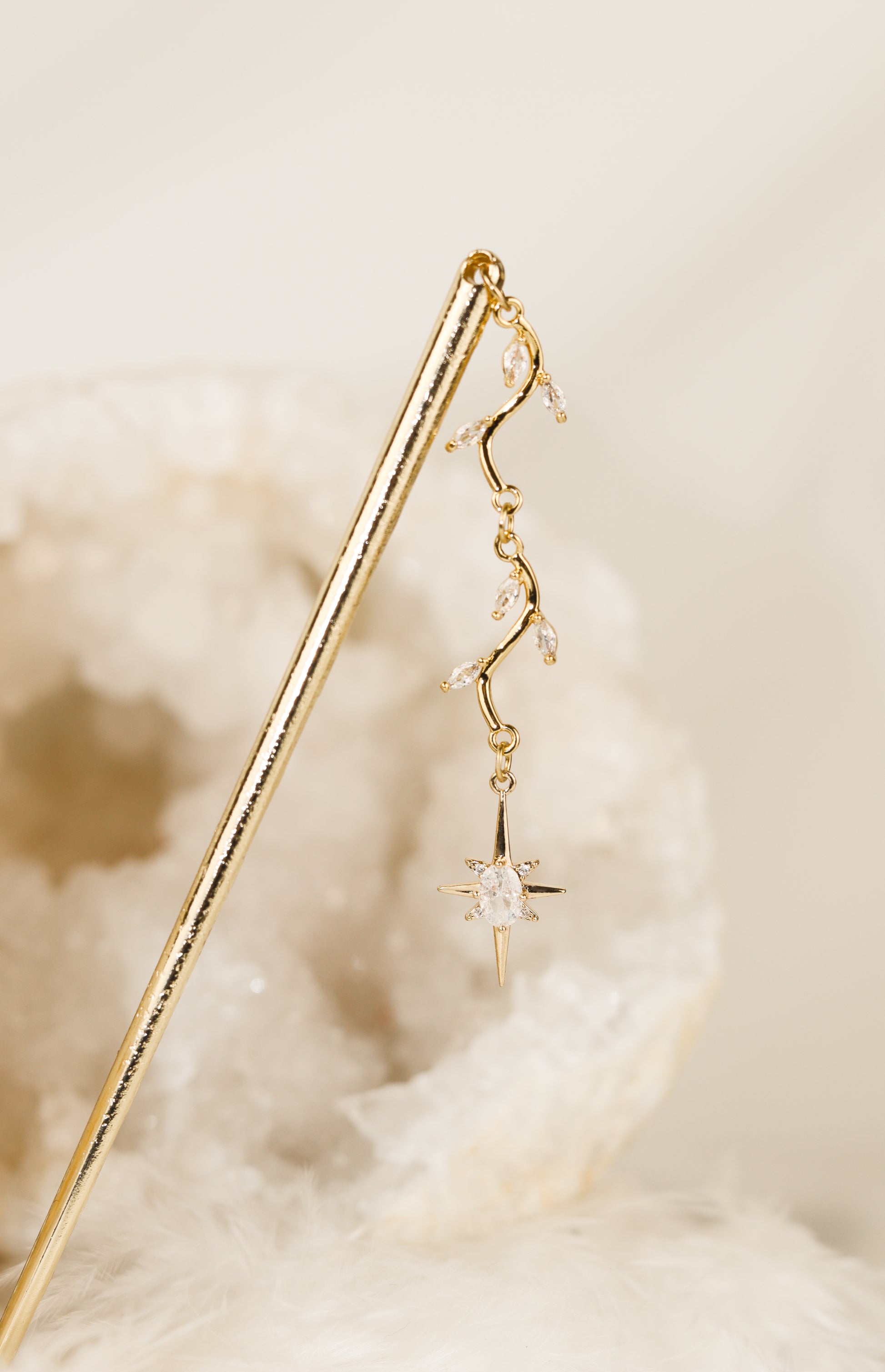 Crystal sky is a 18 carat gold plated hairpin adorned with leafs of zirconias and a zircia morningstar pendant. Pinning your hair up with this is magically stunning in our opinion.