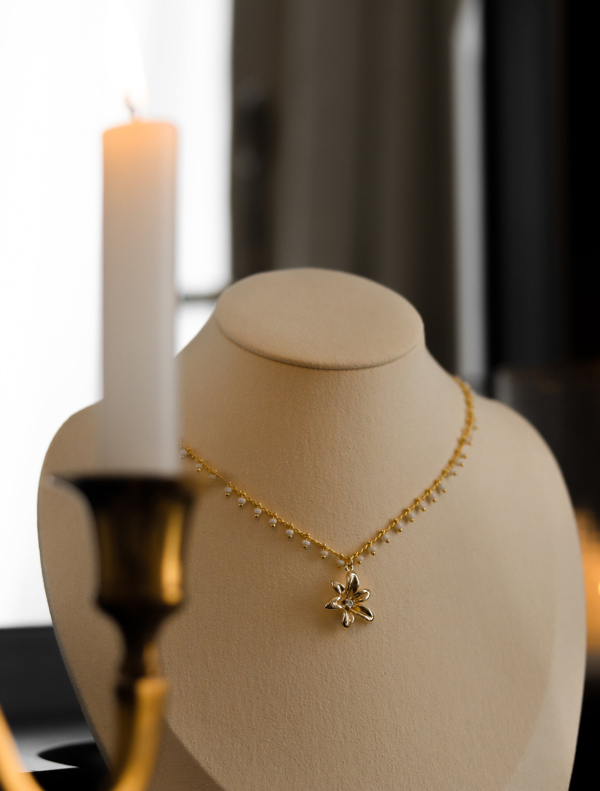 Lily is a gold plated necklace with enamel beads and a gold plated lily charm with a zirconia center. All hardware is gold plated with 18 carat gold.