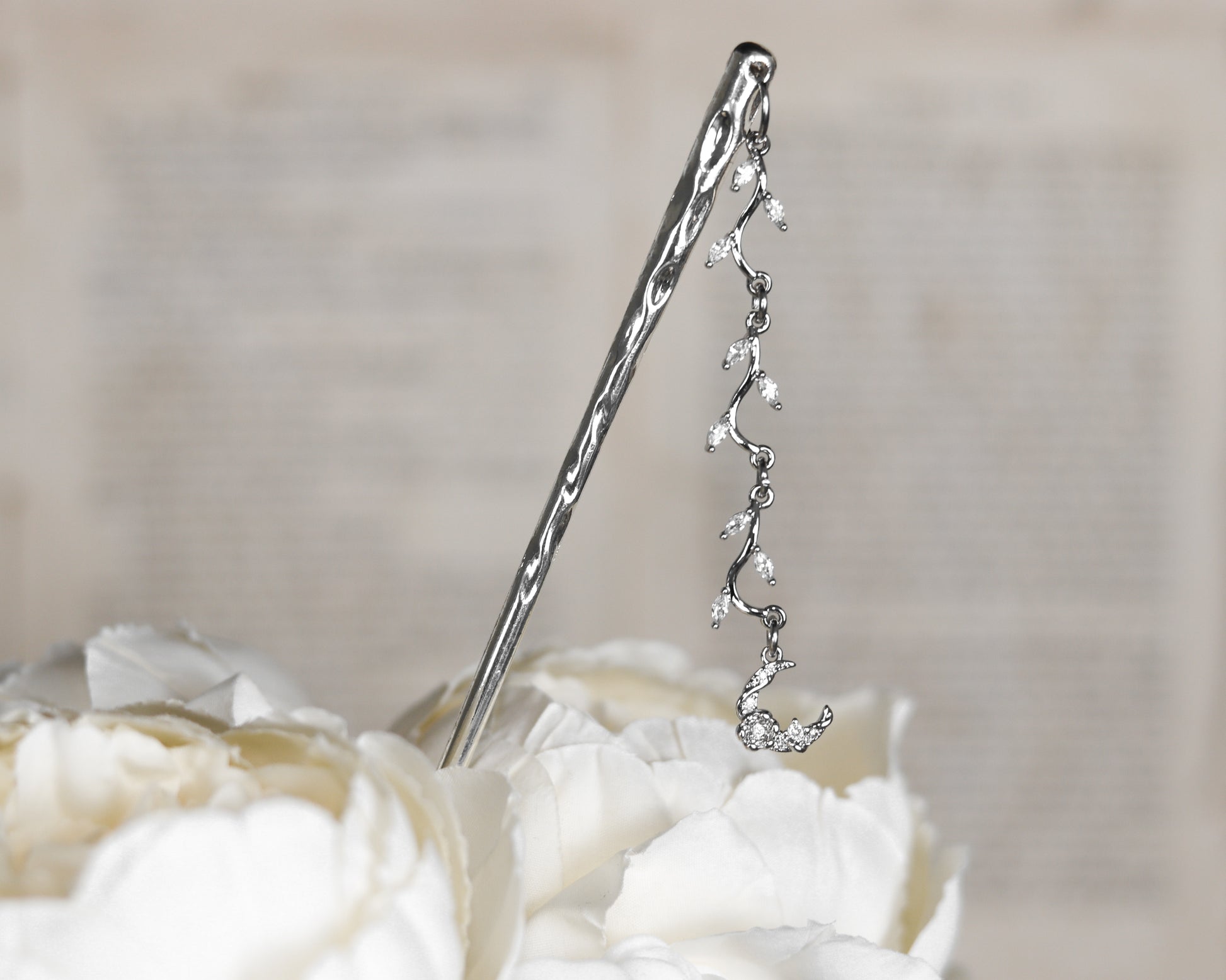 Moonflower, when the beauty of blooming flowers and the beauty of the nightsky meet. Moonflower hairpin adorned with leafs of zirconias and a moon pendant. Pinning your hair up with this is magically stunning in our opinion.