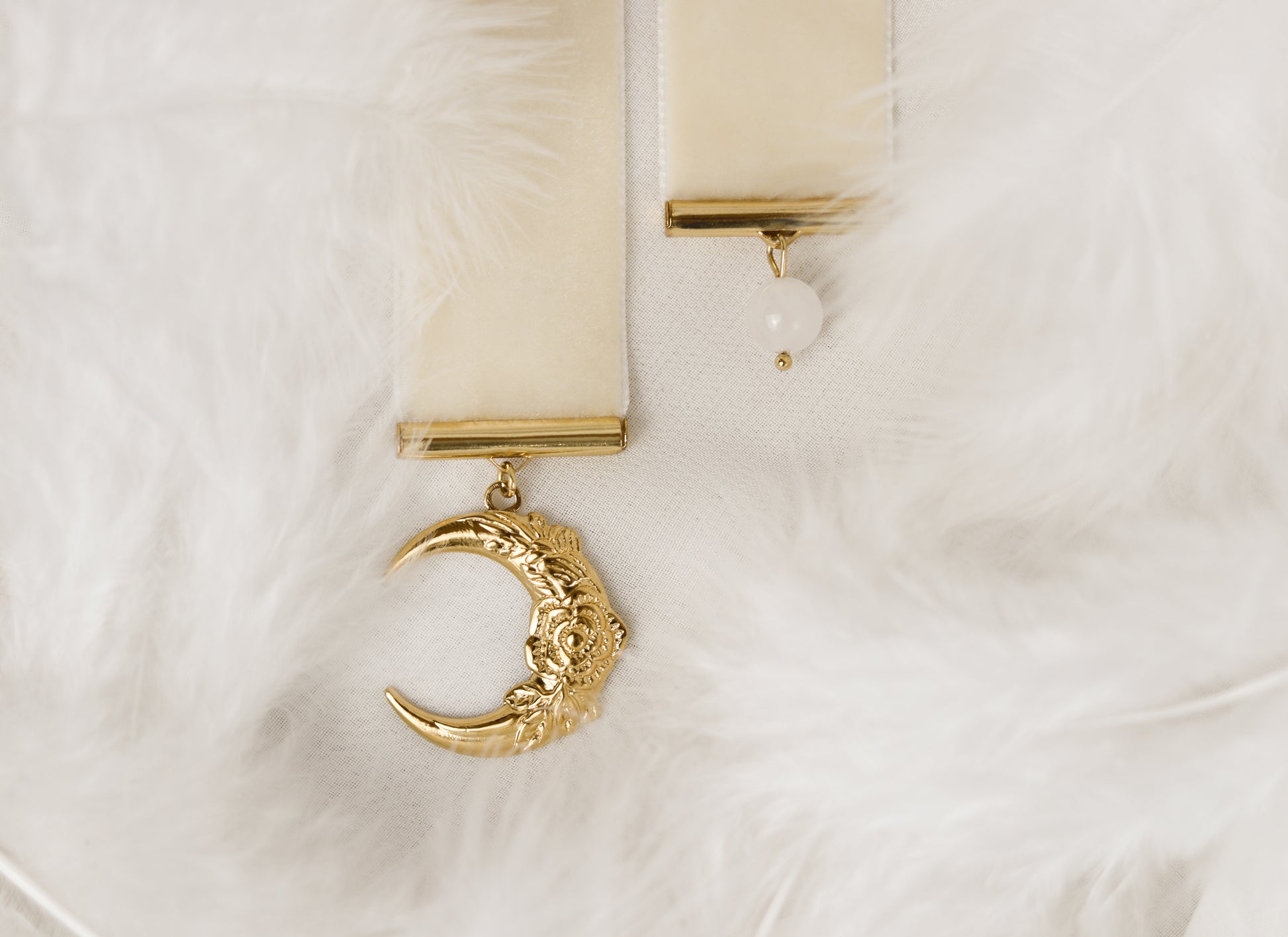 When the beauty of the earth and the beauty of the night sky meet. The Nightbloom fantasy bookmark is made of luxurious velvet with 18 carat gold plated hardware and a white quartz charm.