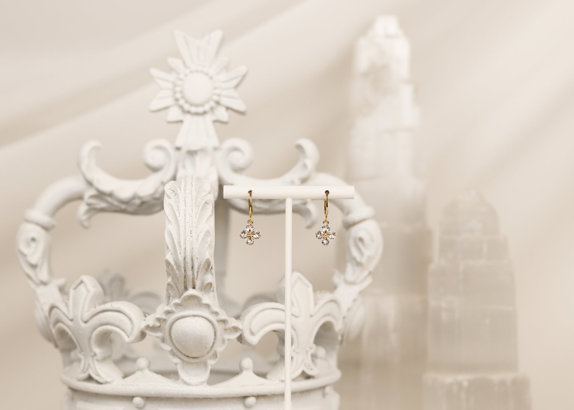 The Regel Elegance earrings are gold plated with a charm with beautiful round zirconias. All hardware is gold plated with 18 carat gold. The earrings are circa 4,5 centimeters long.