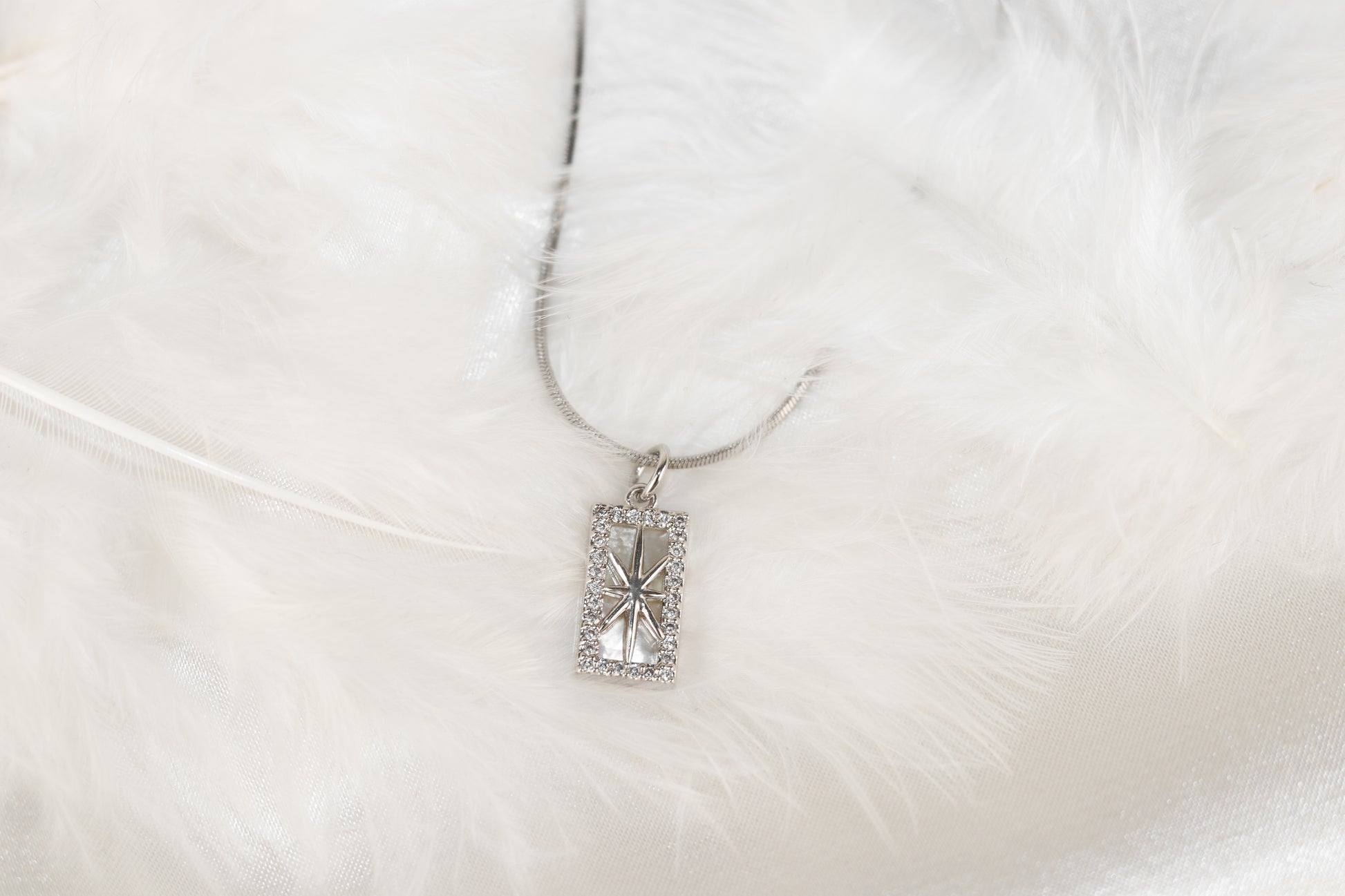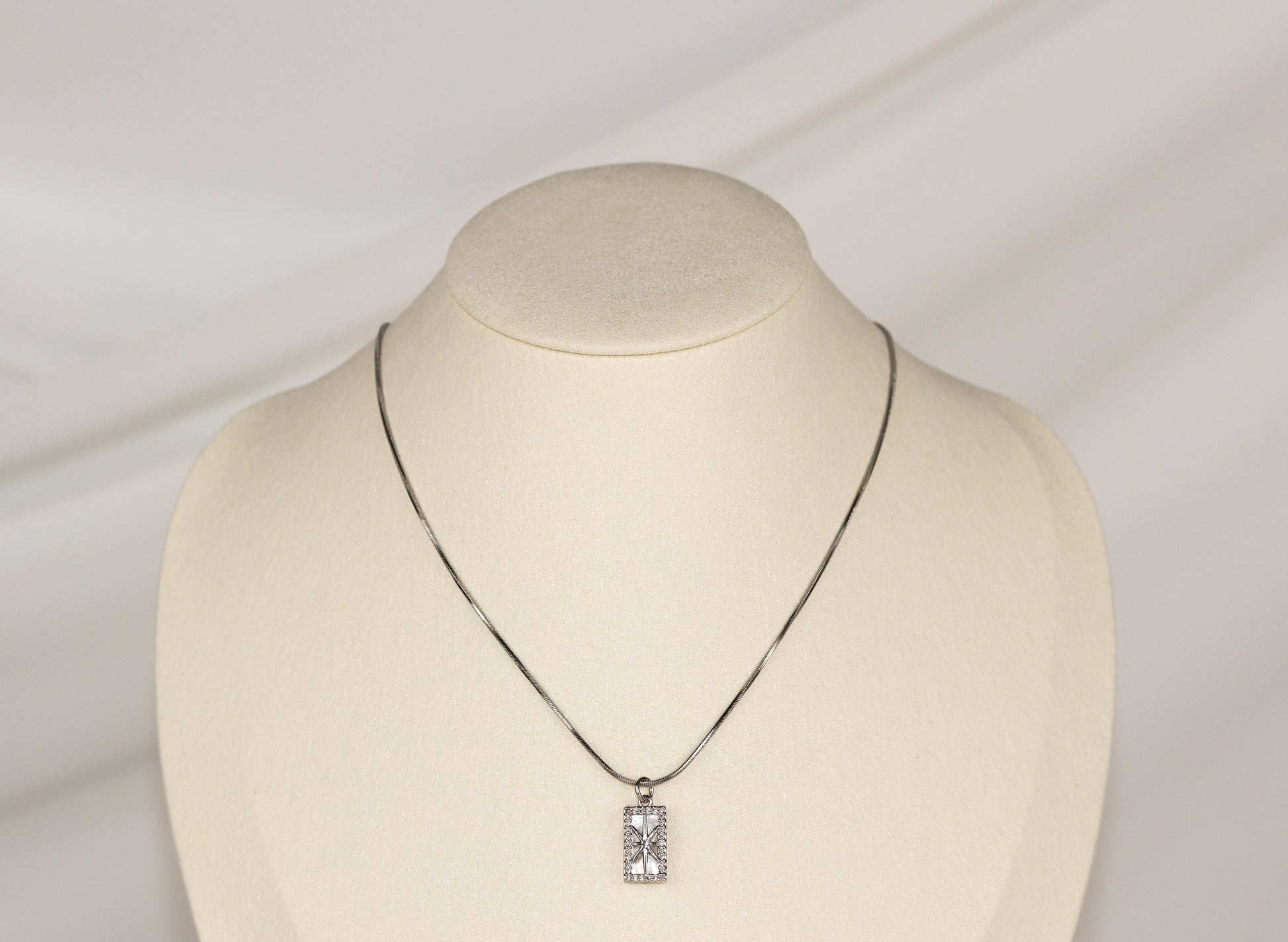 Starfall is a dainty necklace with a small framed star as a pendant. The star pendant is encrusted with zirkonias.