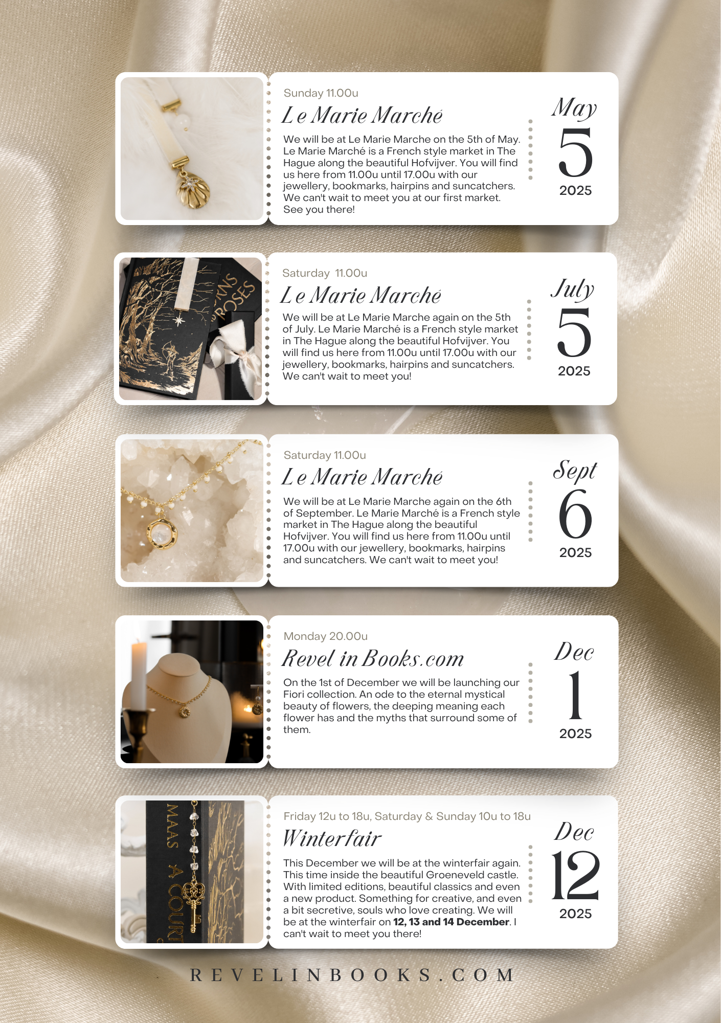 Revel in Books is regelmatig aanwezig op evenementen en markten. We ontmoeten je graag en horen graag wat je van onze collectie vindt. Vaak testen we nieuwe ontwerpen tijdens evenementen, dus misschien kun je iets bemachtigen dat nog niet officieel is uitgebracht. Oh… en we praten ook graag met je over boeken! Maar eerlijk gezegd… wie niet?